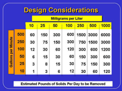 The Table on the left of TSS in mg/l vs. flow in GPM is employed to estimate the Solids Entering a Filter and Solids the Filter did not Remove. The Table on the right displays a lab sample PSD that is employed to determine the optimum filter's micron rating. The final truth is a full flow test of the selected filter in the plant environment employing the true fluid and true solids.